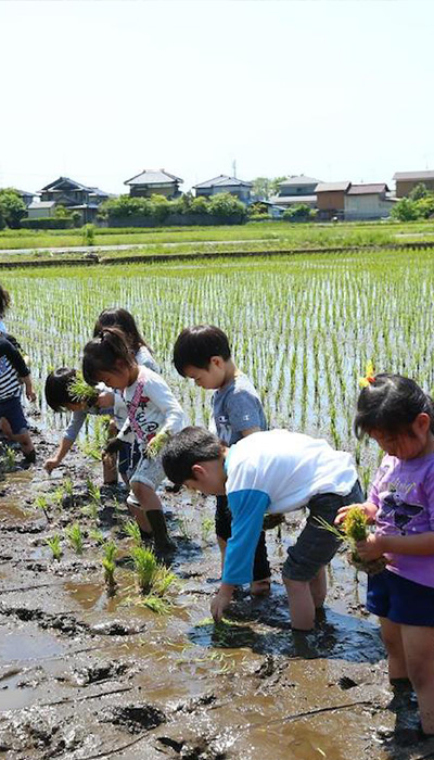 田植えや畑作りを通じ食物の育つ過程や命をいただく大切さを学びます。収穫食材を用いて栄養満点の給食を提供するだけでなく、食事マナーや食文化の伝承にも力を入れています。